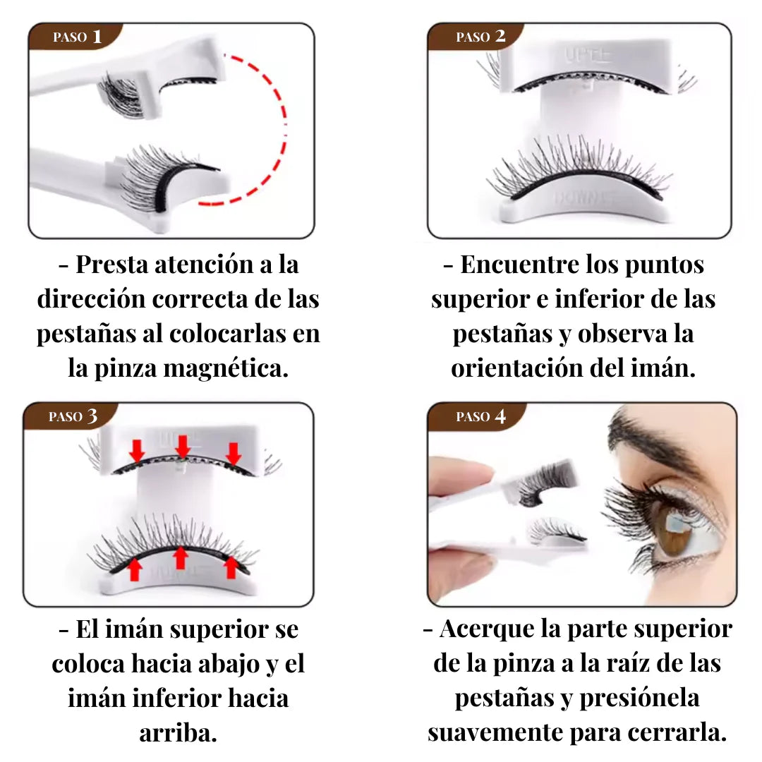 Para quitarlas, no tires directamente de las pestañas. Simplemente desliza suavemente los imanes hacia los lados hasta que se separen; de este modo saldrán sin problemas y sin causar daño.